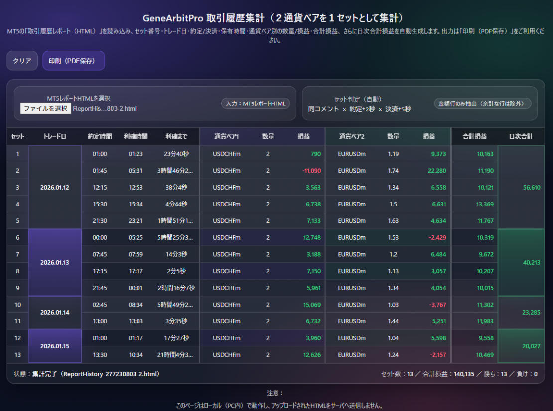 MT5の「取引履歴レポート(HTML)」を読み込み、セット番号・トレード日・約定/決済・保有時間・通貨ペア別の数量/損益・合計損益、 さらに日次合計損益を自動生成します。出力は「印刷(PDF保存)」をご利用ください。