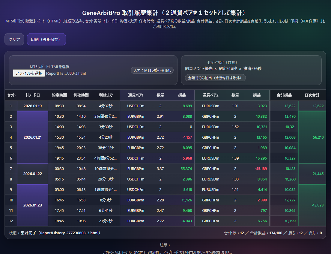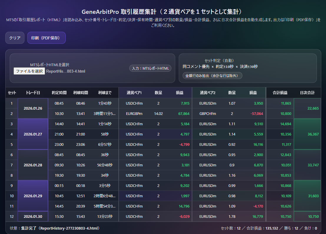 GeneArbitPro 取引履歴集計(2通貨ペアを1セットとして集計)