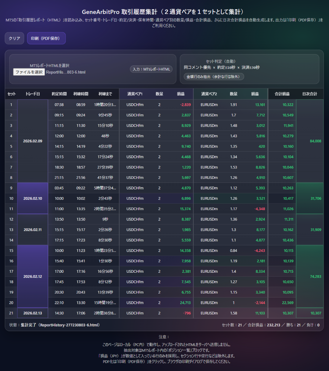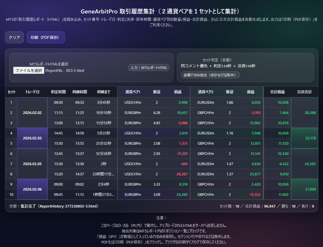 MT5の「取引履歴レポート(HTML)」を読み込み、セット番号・トレード日・約定/決済・保有時間・通貨ペア別の数量/損益・合計損益、 さらに日次合計損益を自動生成します。出力は「印刷(PDF保存)」をご利用ください。